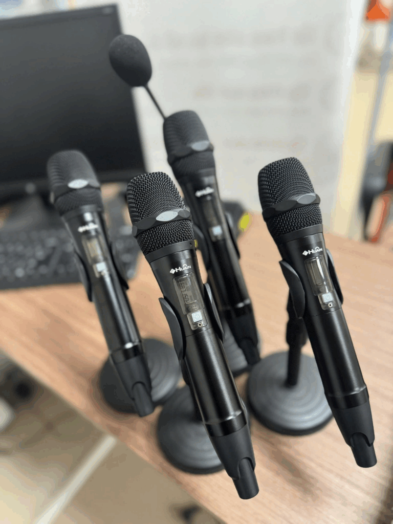 Hệ thống được trang bị 04 micro cầm tay không dây HUAIN, phù hợp cho nhiều hình thức họp: thảo luận nhóm, hội nghị quy mô lớn hay các buổi thuyết trình chuyên nghiệp.